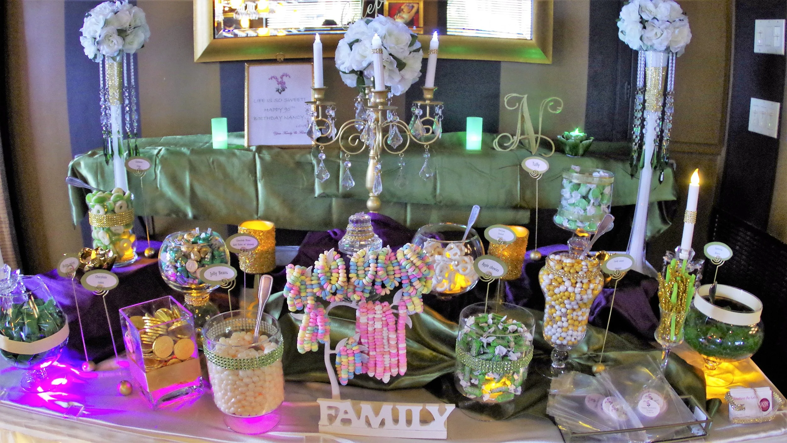 Beautifully Decorated Candy Jars, Gourmet Candy, Table Linens, Scoops and Tongs, Take-Home Bags all personalized to your individual theme and or designs with complete setup and take-down service.